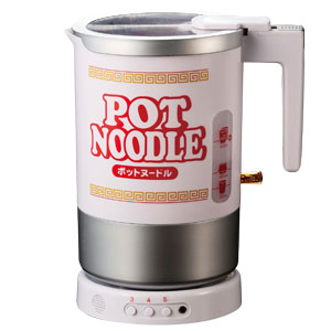 目盛に合わせて水を入れスイッチをポンと押せば約3分で適量のお湯が沸く、カップ麺専用ポットです。小タイプのカップ麺、小タイプのカップ麺×2個(普通タイプ1個分)、焼きそばタイプと、それぞれのタイプごとの適量目盛付きだからムダなく沸かせ、沸いたらチャルメラの音で知らせてくれて、自動でスイッチオフ。ボタンひとつでふたが左右に開くのでケトル本体に水を入れ易く、ふたを開けずにお湯を注げるから、スピーディにカップ麺の出来上がり。目分量でお湯を沸かして量が多すぎたり逆に少なすぎて沸かし直したり空焚きしたり、といった面倒もムダもありません。毎日でも食べたいカップラーメン党には手放せないニューアイテムです。