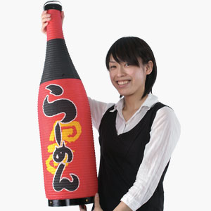 料理自慢の女房のために、ちょっと小粋に飾ってみたのがこの変わり種提灯。会社の同僚を家に呼ぶたびに毎回ちょっとした話題の的だ。「この店は料理が旨いしもてなしも最高」と大好評で、私の鼻も高い。どんちゃん騒いで呑み明かしても「看板よ」なんて「いけず」は言われないし、じきに「酒処」提灯が「ラーメン」提灯に早変わりして「やっぱり酒の後はコレだな?」なんてみんなでしみじみ麺をすすれる。ユーモラスな外観ながらも、実は職人作りの本格提灯であるのが自分だけの隠れたこだわり。そんな瓶型提灯が目印の酒処「我が家亭」は今夜も満員御礼だ。